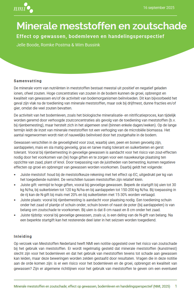 Door toepassing van de vier juistheden van bemesting – juiste meststof, hoeveelheid, plaats en tijdstip – kan het risico op zoutschade verder worden geminimaliseerd. Bij normaal landbouwkundig gebruik is het risico zeer beperkt, zeker gezien de huidige lagere bemestingsniveaus. Dit maakt minerale meststoffen een betrouwbare en veilige keuze voor een duurzame gewasproductie.